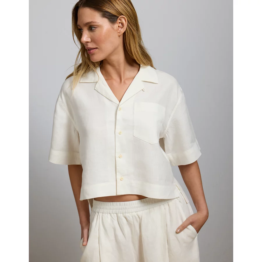 European Flax-certified linenCamp collar designed to lay flatButton front closure 100% LinenMachine wash. Lay flat to dry.Imported Relaxed, boxy fitCropped