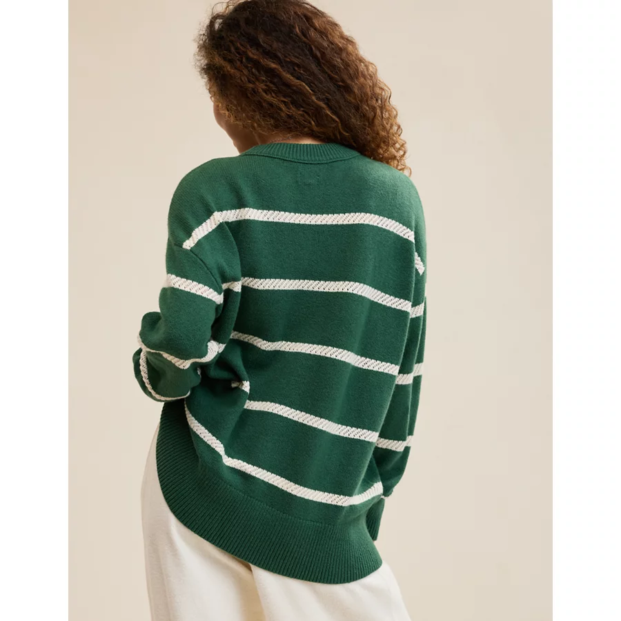 Real Good lightweight yarnRibbed trim on the neckline, cuffs and hemopen knit stripe detailAccessibility deets: wide neck and over-the-head access