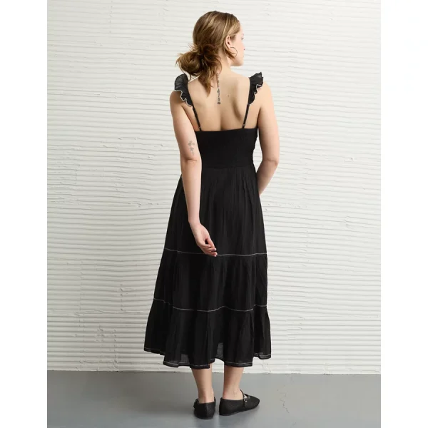 Flutter strapsV-neckSmocked bodice with v-waistTiered skirt 100% CottonMachine washImported Fit & flare silhouetteMidi lengthSleeveless