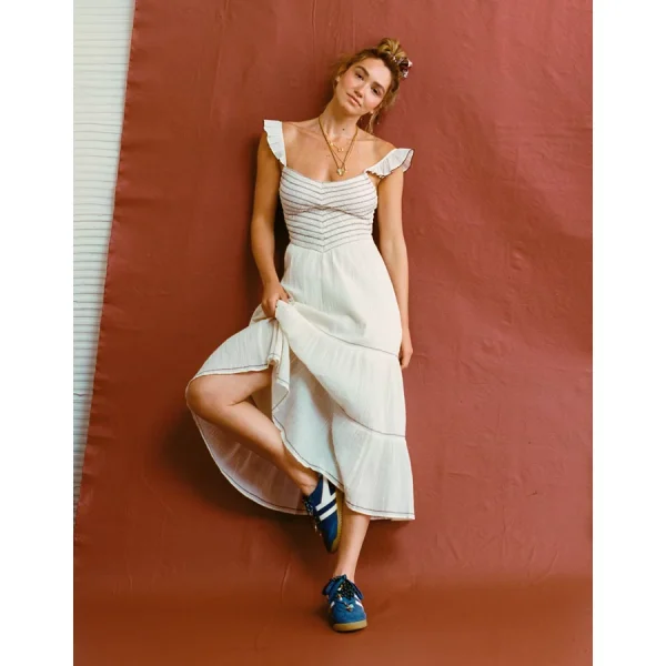 Crisp cotton fabricSpaghetti strapsSquare neckCorded smockingRuffle detailsSide tie details 100% CottonMachine washImported Fit & flare silhouetteMidi lengthSleeveless