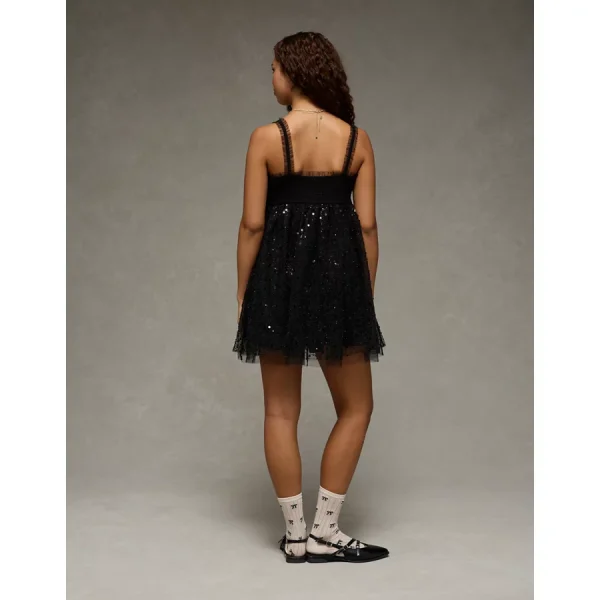 Sequined woven fabricationSweetheart neckSleevelessRuched bust 100% PolyesterMachine washImported Babydoll silhouetteMini length