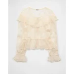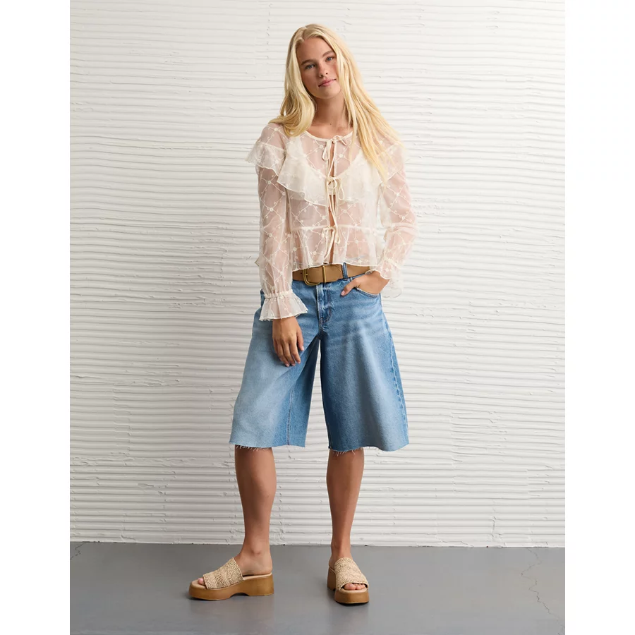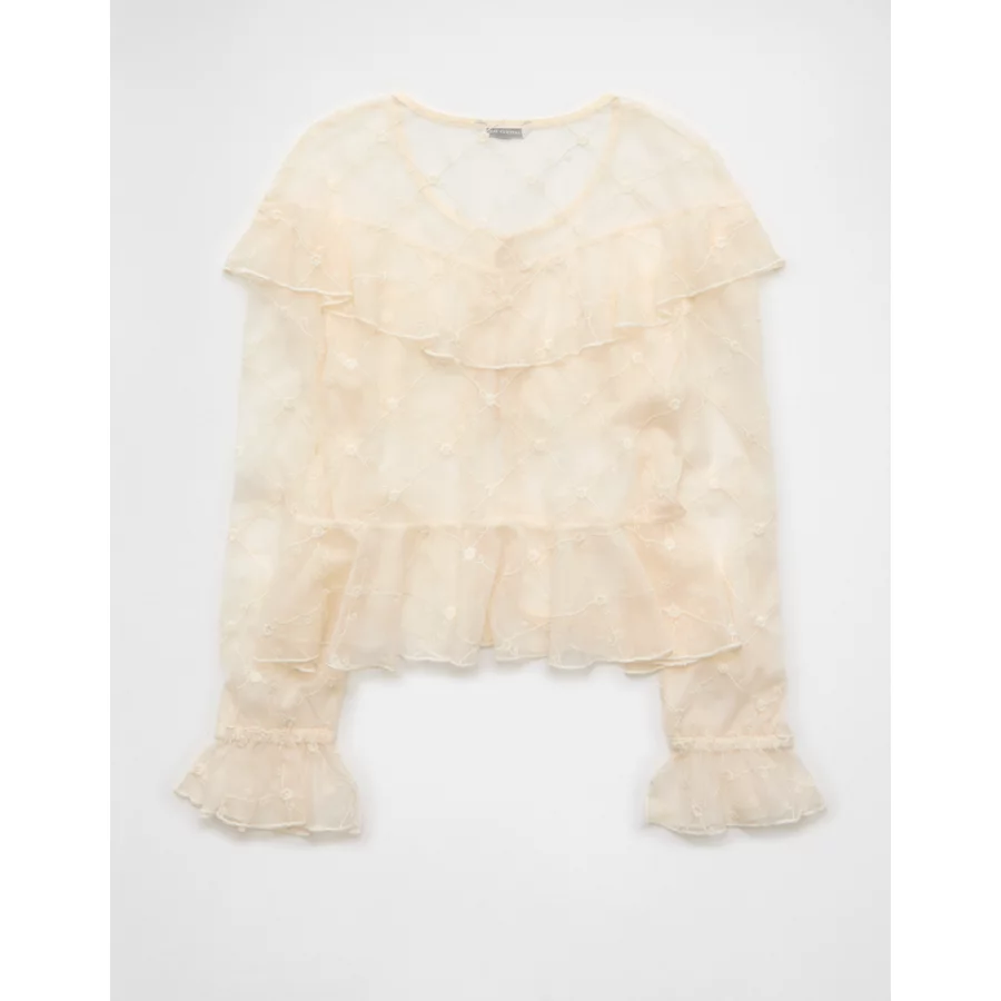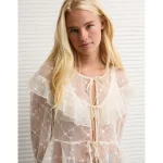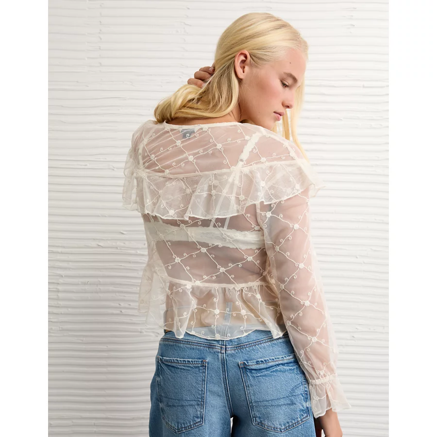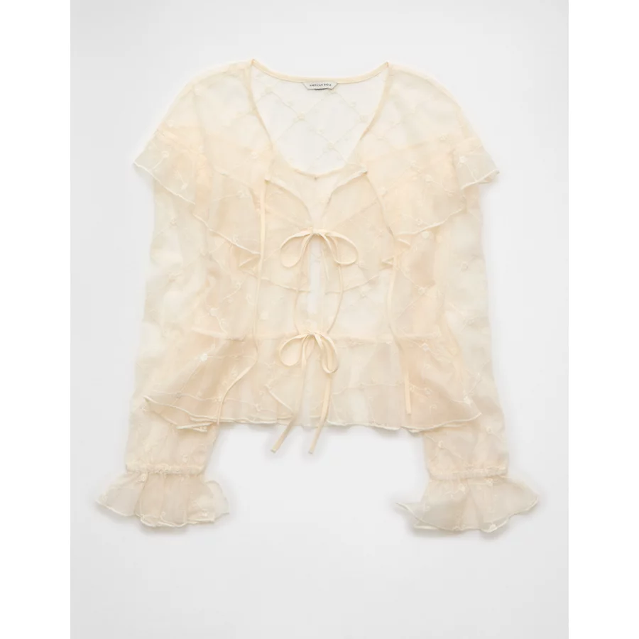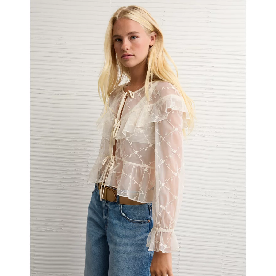 AE Embroidered Tie-Front Mesh Blouse – Cream