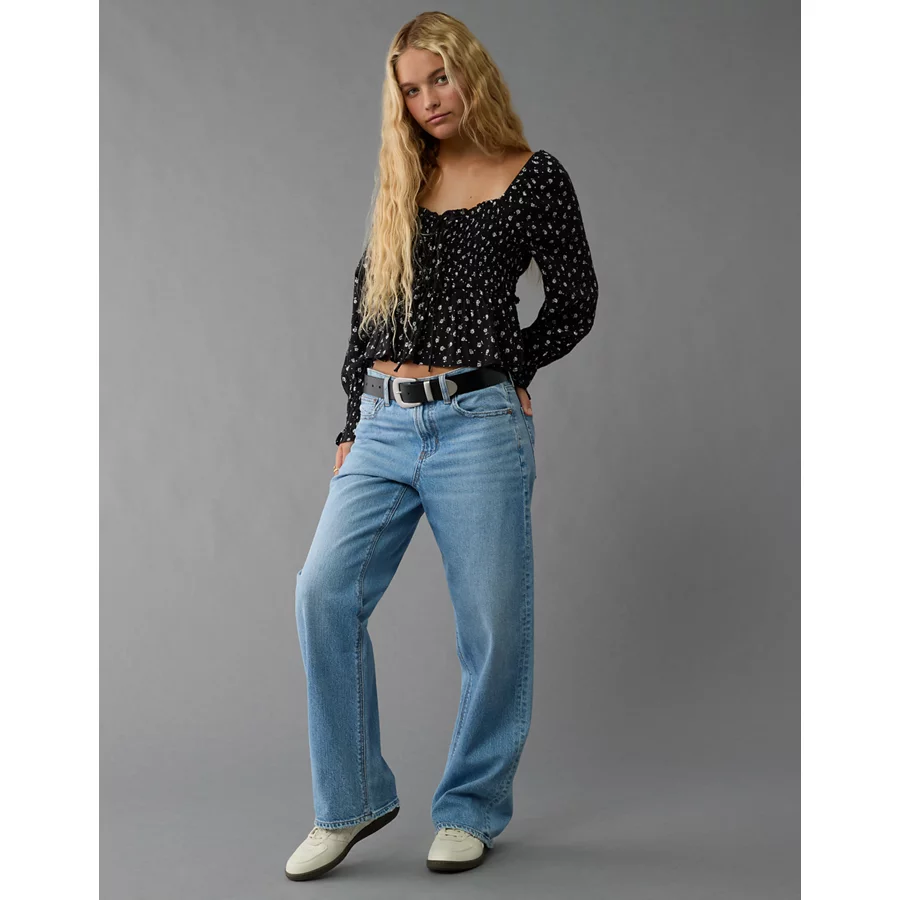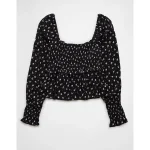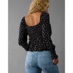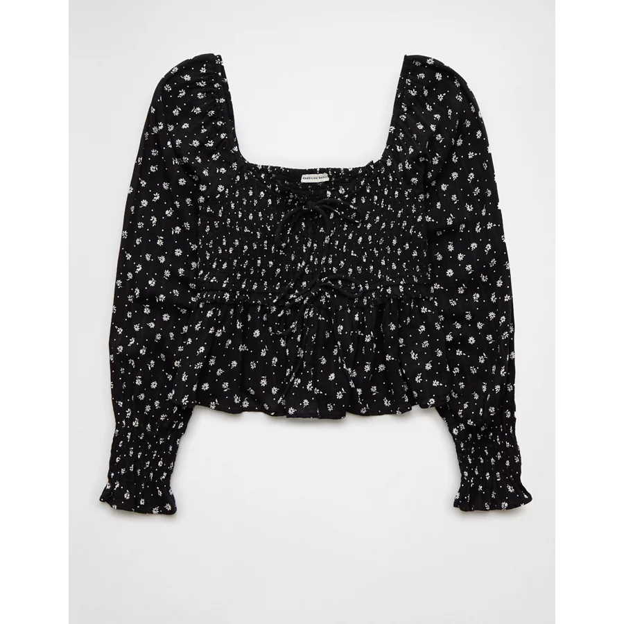 AE Long-Sleeve Smocked Tie Front Blouse – Black