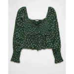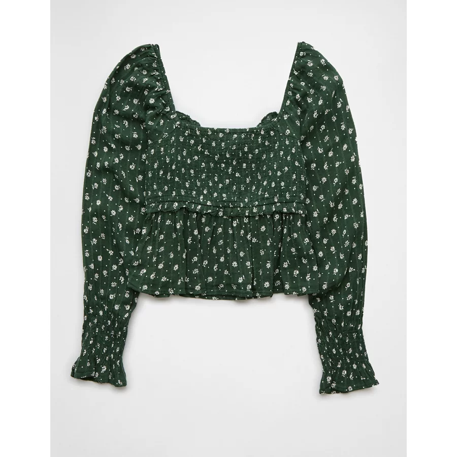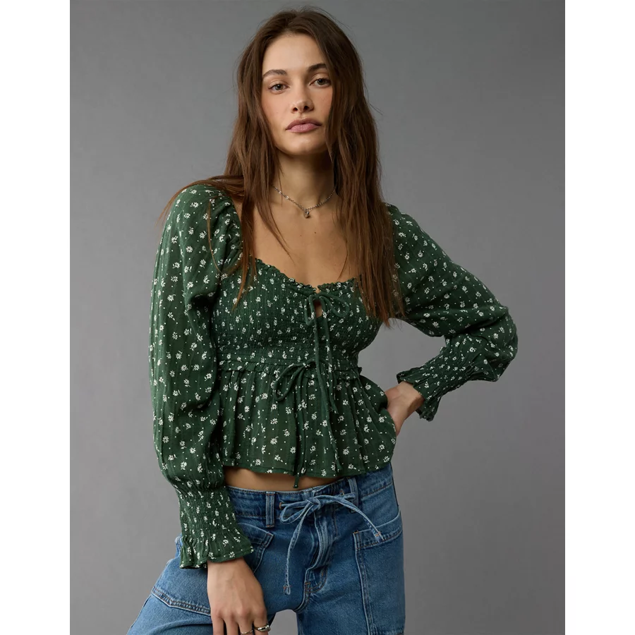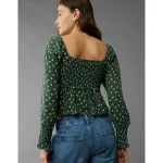 AE Long-Sleeve Smocked Tie Front Blouse – Green