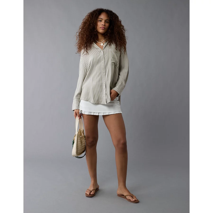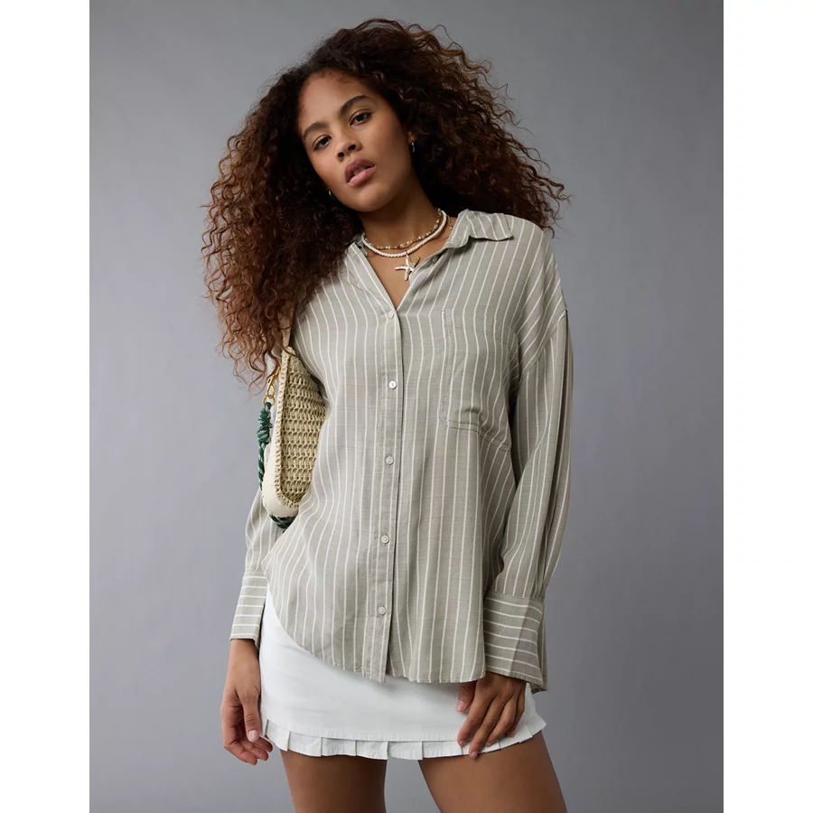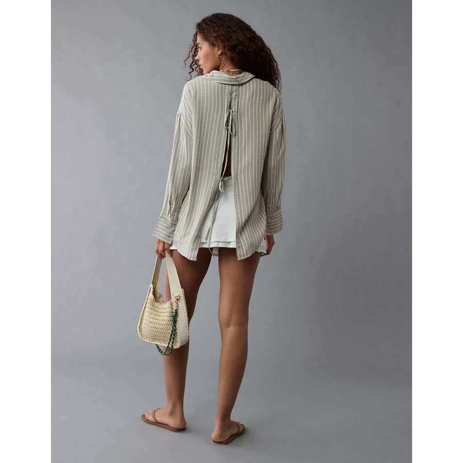 AE Long-Sleeve Tie Back Button-Up Shirt – Olive