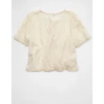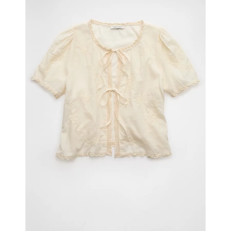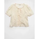 AE Short-Sleeve High Neck Tie Front Shirt – Cream