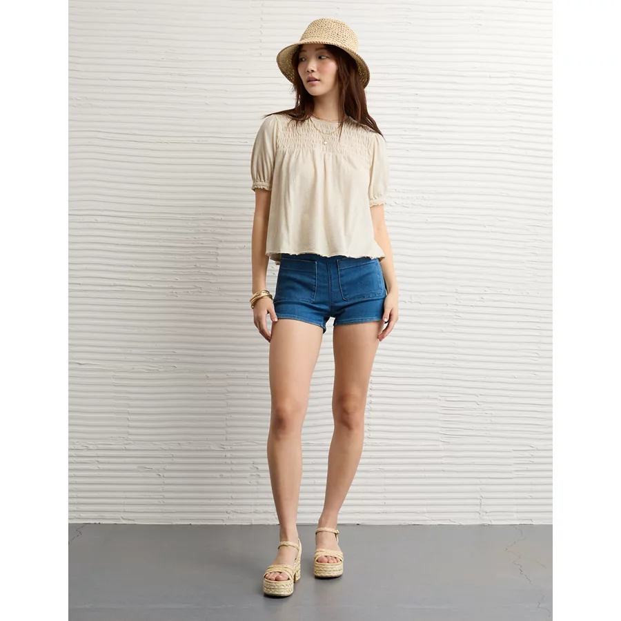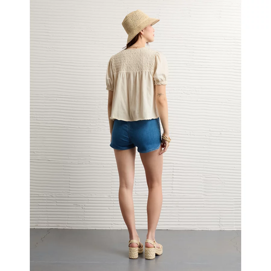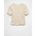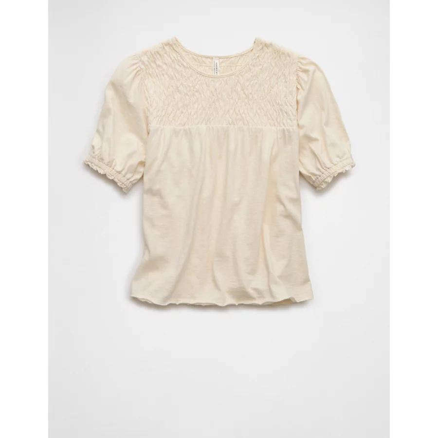 AE Sunchaser High Neck Puff Sleeve Smocked T-Shirt – Cream