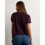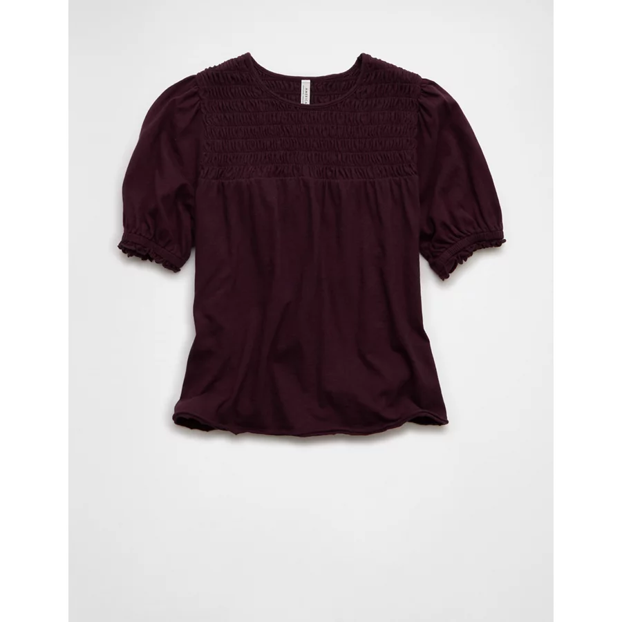 AE Sunchaser High Neck Puff Sleeve Smocked T-Shirt - Berry