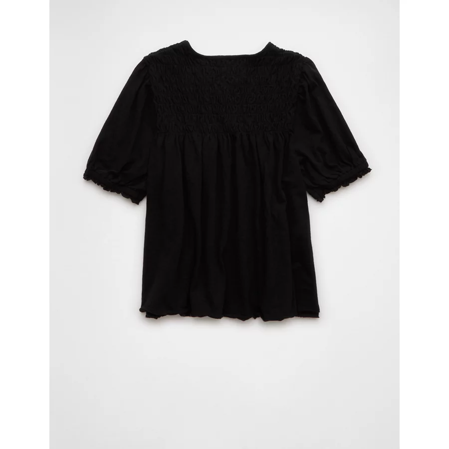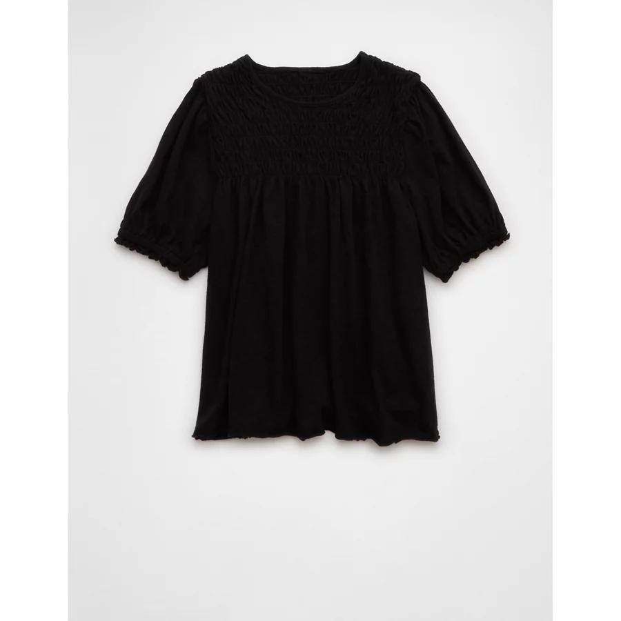 AE Sunchaser Knit Puff Sleeve Smocked T-Shirt – Black