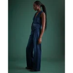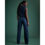 Cut in rigid, drapey dark wash organic denim
