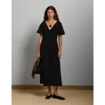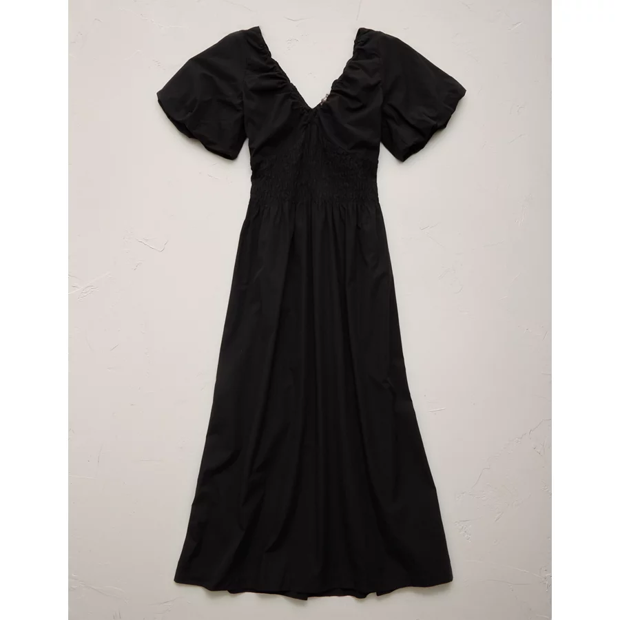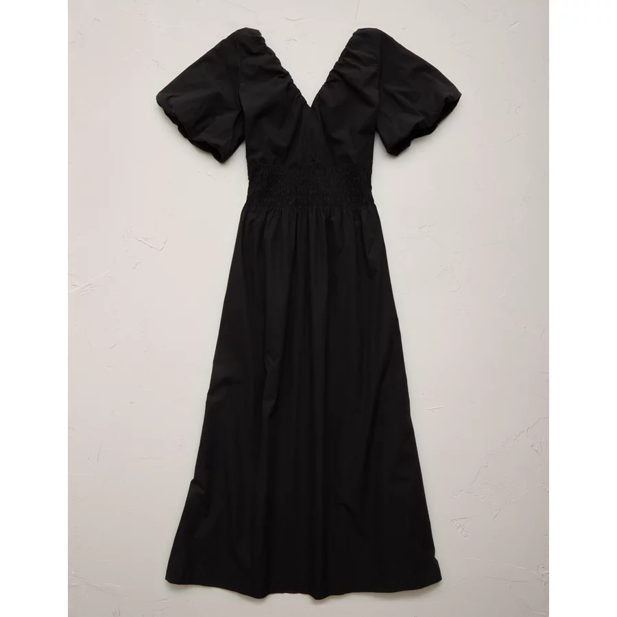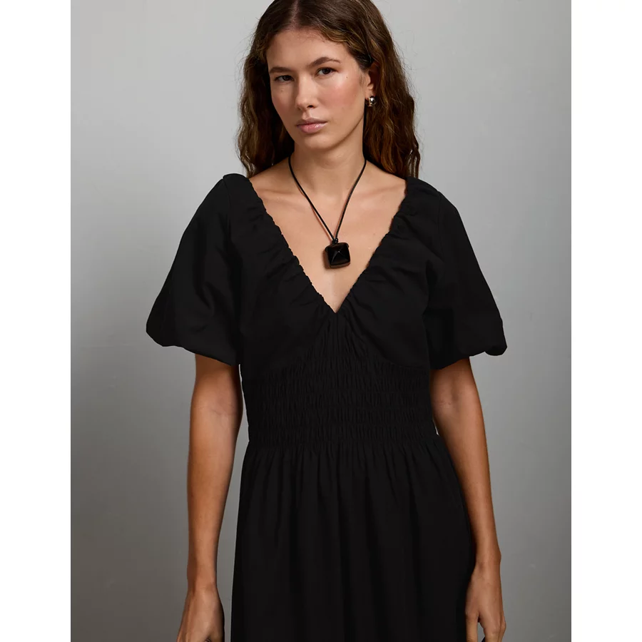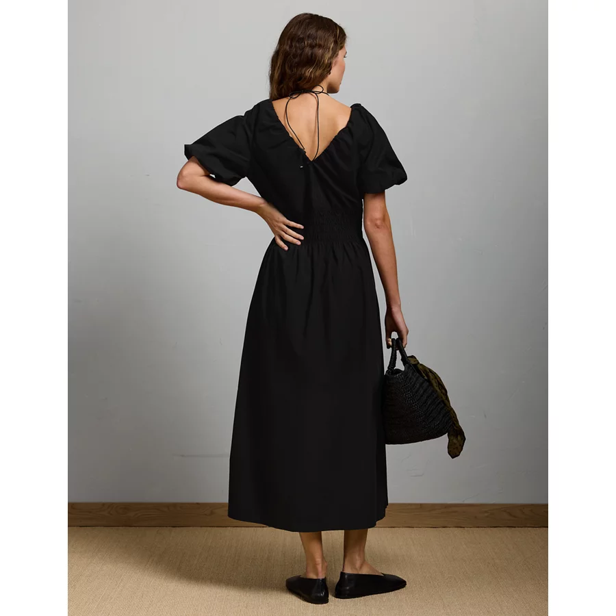 AE77 Premium Puff Sleeve Midi Poplin Dress – Black