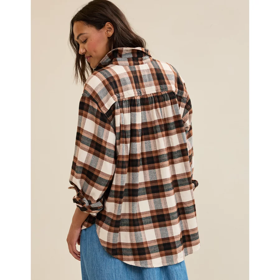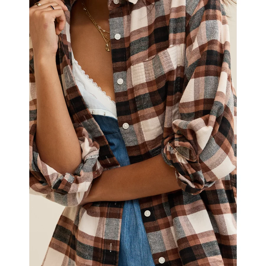 Soft, cozy flannel with a fun plaid printOversized chest pocket (for ALL your sunshine)Functional buttons 100% CottonMachine washImported Oversized and