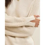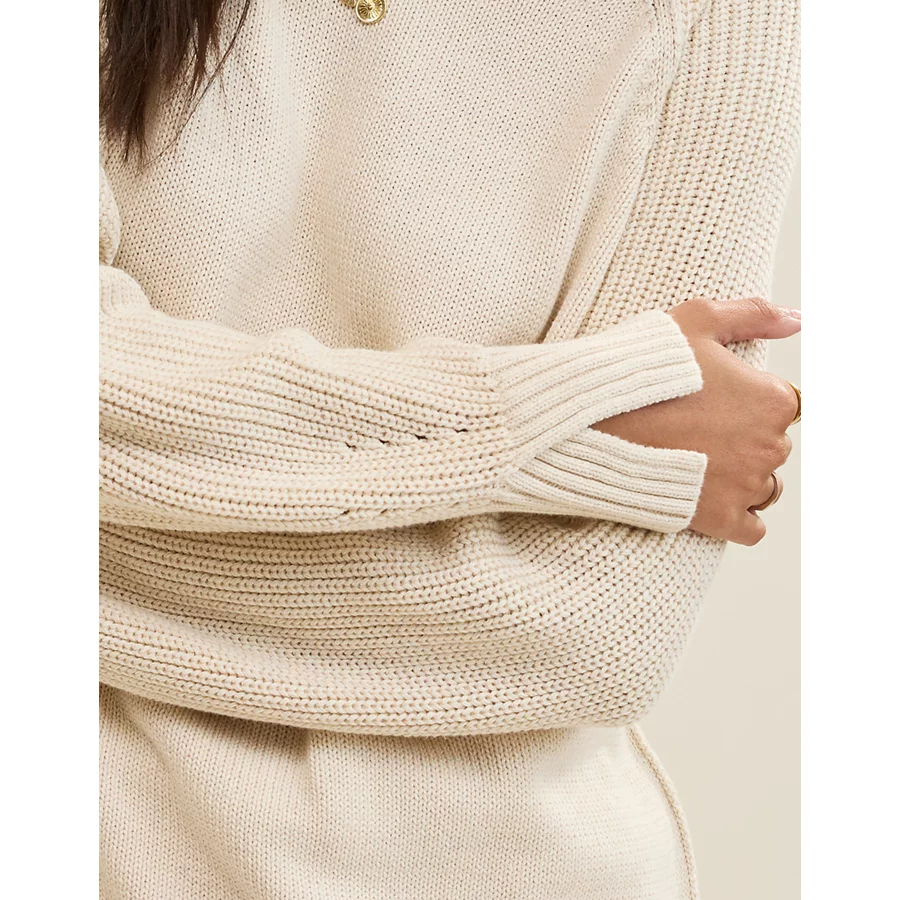 Real Good Everyday yarnRolled necklineRibbed trim on cuffs and hemPointelle deets and split cuffs on the sleevesStripedAccessibility deets: over-the-head access