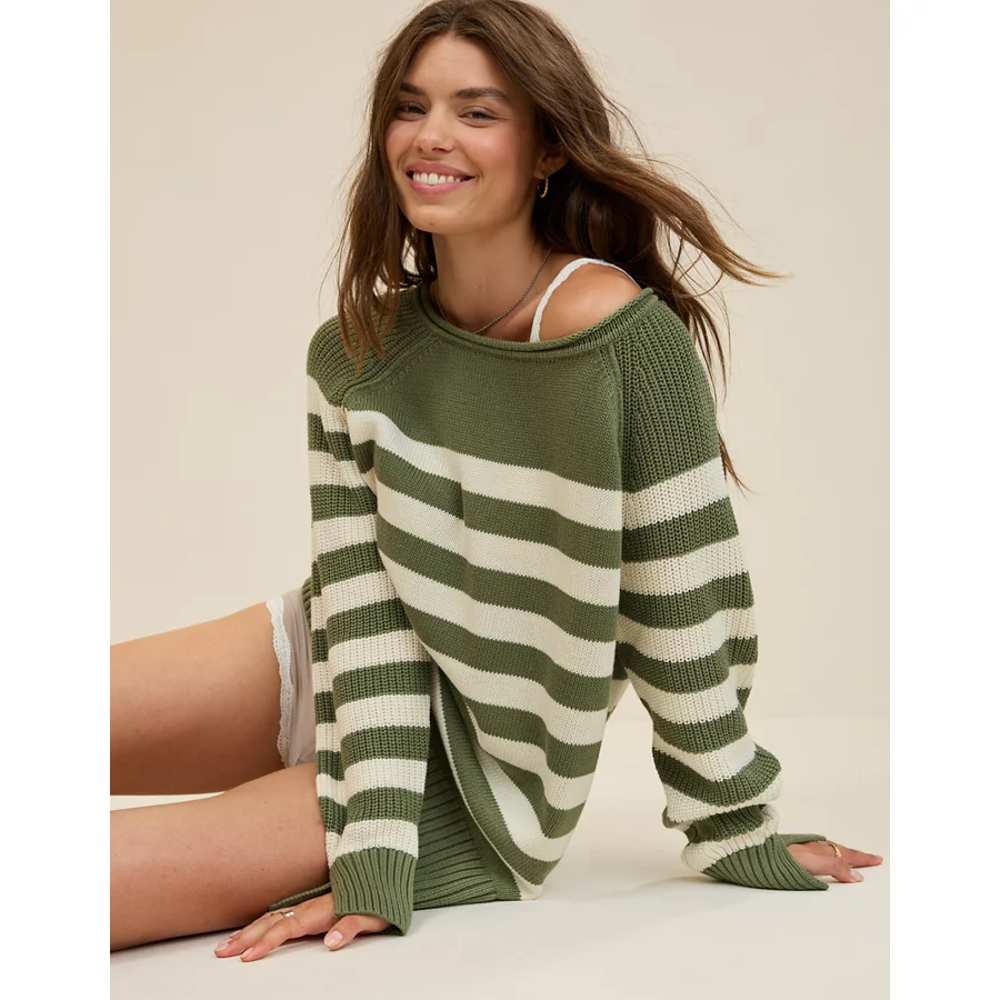 Real Good Everyday yarnRolled necklineRibbed trim on cuffs and hemPointelle deets and split cuffs on the sleevesStripedAccessibility deets: over-the-head access