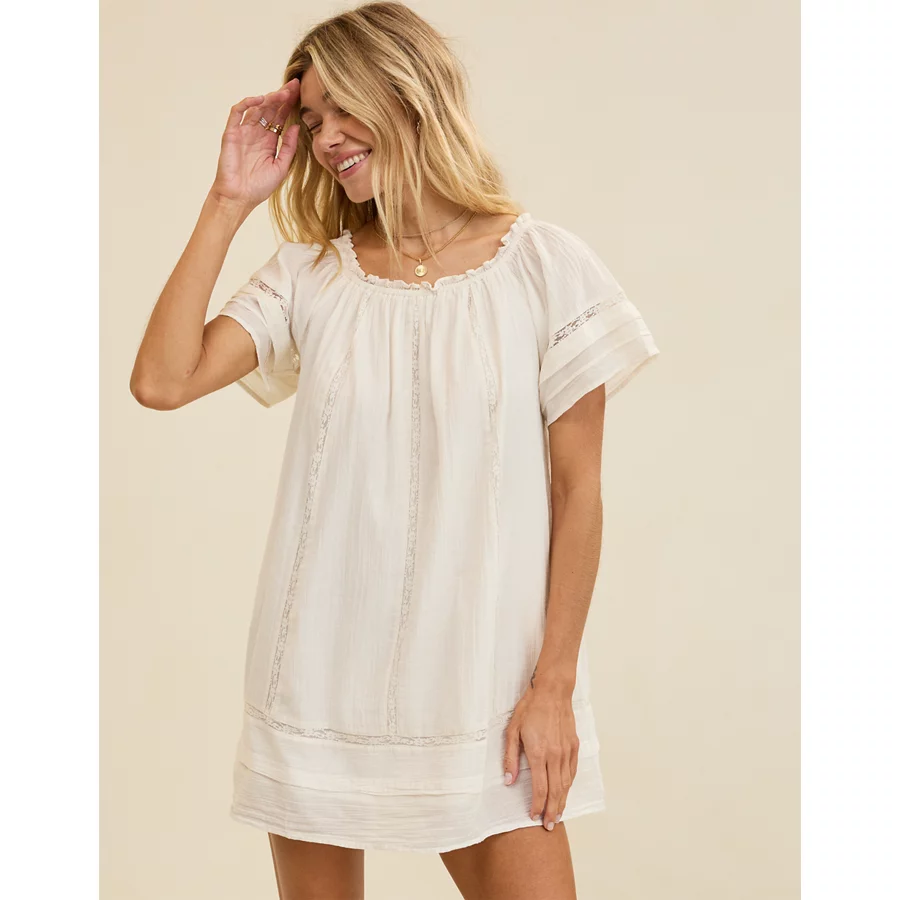Mixed fabrics! Soft, stretchy knit bodice with a lightweight gauzey skirtScoop necklineSide seam pockets (!!)Accessibility deets: over-the-head access for easy