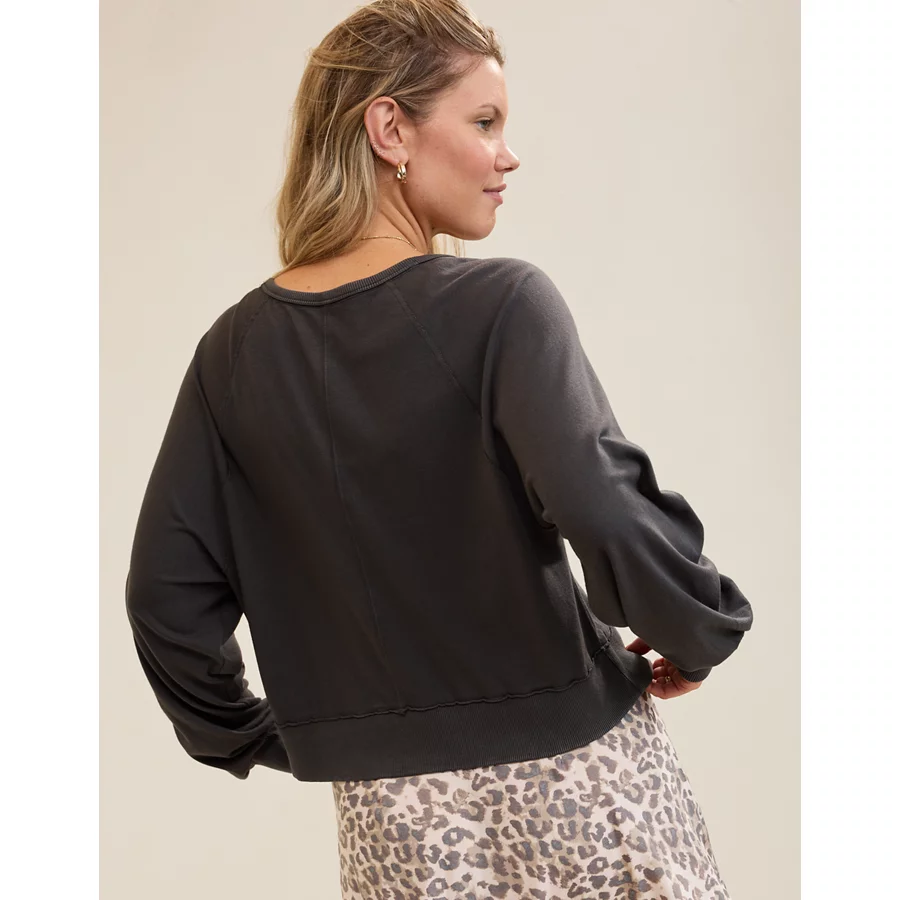 Real Good Everyday yarnRolled necklineRibbed trim on cuffs and hemPointelle deets and split cuffs on the sleevesThis style is heathered