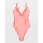 Aerie Shine Lace Plunge One Piece Swimsuit – Coral Crush