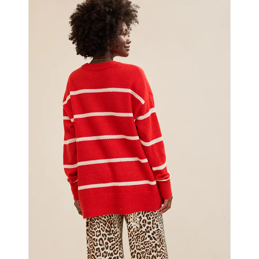 Real Good Everyday yarnRolled necklineRibbed trim on cuffs and hemPointelle deets and split cuffs on the sleevesStripedAccessibility deets: over-the-head access