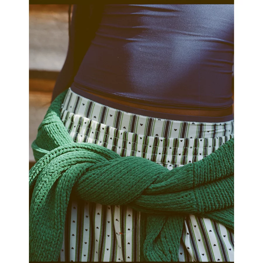 Real Good Everyday yarnRolled necklineRibbed trim on cuffs and hemPointelle deets and split cuffs on the sleevesStripedAccessibility deets: over-the-head access