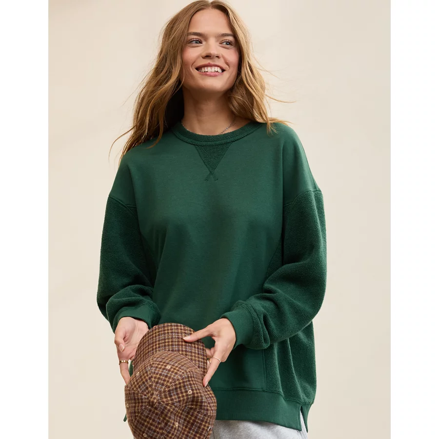 Real Good Everyday yarnRolled necklineRibbed trim on cuffs and hemPointelle deets and split cuffs on the sleevesThis style is heathered