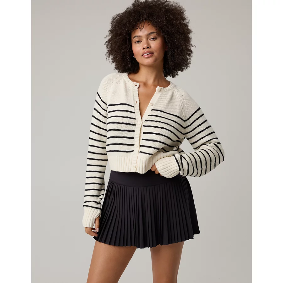 Real Good Everyday yarnRolled necklineRibbed trim on cuffs and hemPointelle deets and split cuffs on the sleevesStripedAccessibility deets: over-the-head access