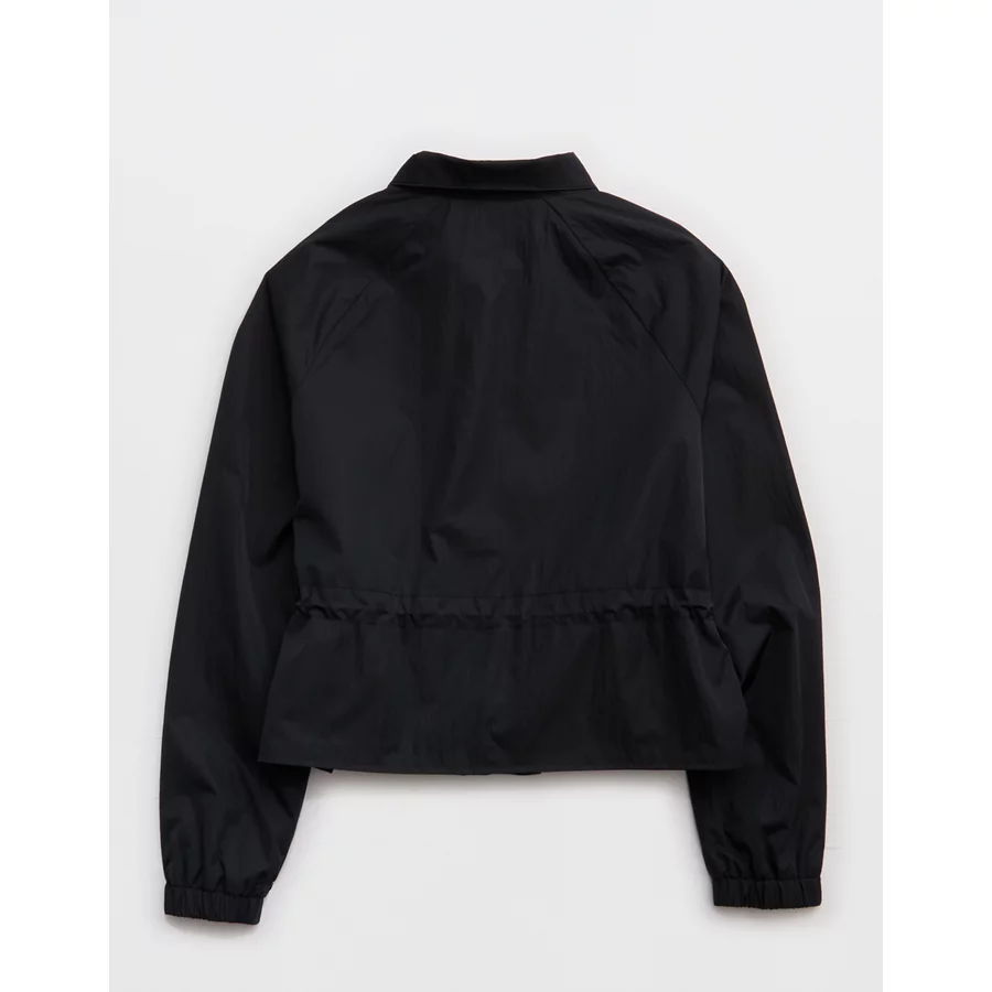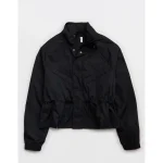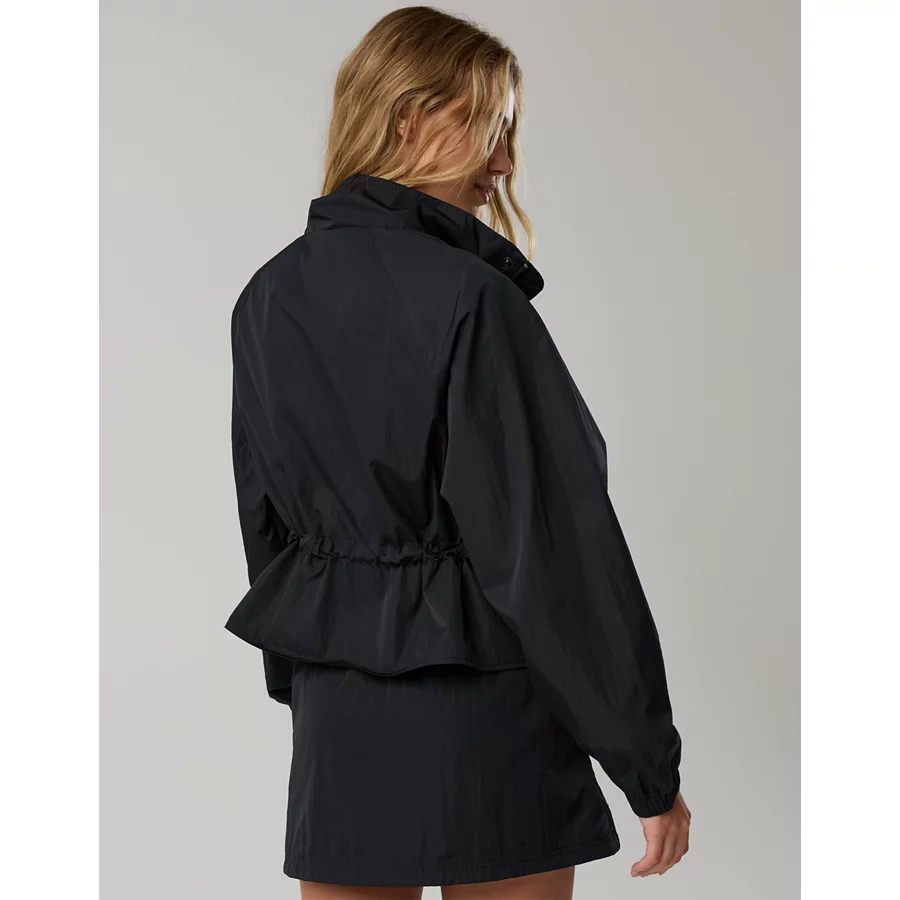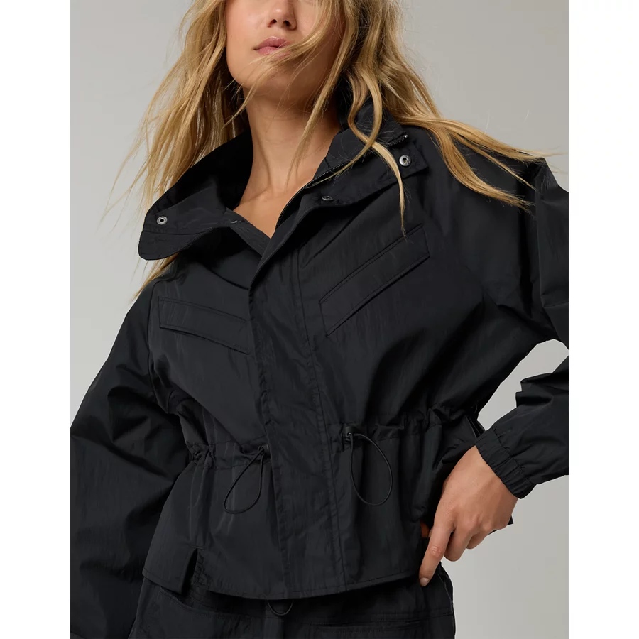 THE LOOK: Smooth & slick. Cinch waist with bungee cords. Mock neck collar.