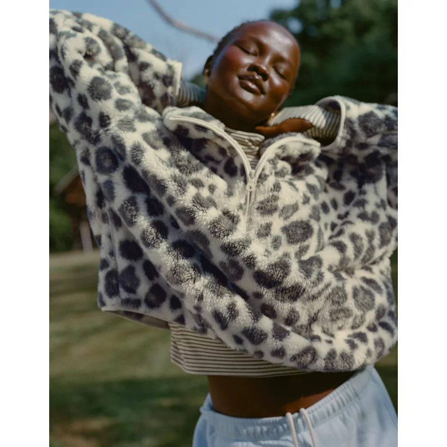THE LOOK: Like a teddy bear you can wear. Quarter zip neckline.