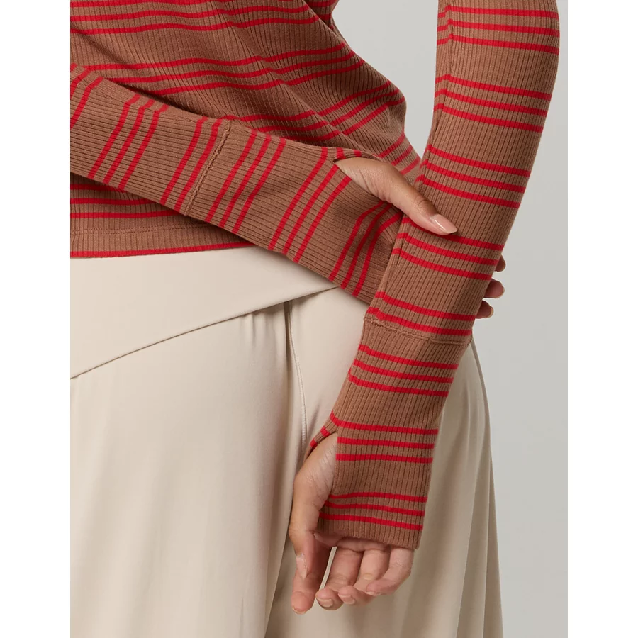 Real Good Everyday yarnRolled necklineRibbed trim on cuffs and hemPointelle deets and split cuffs on the sleevesStripedAccessibility deets: over-the-head access