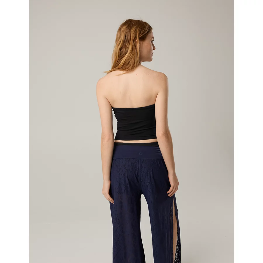 THE LOOK: Strapless with tie at front. Silky smooth. Subtle rib knit.