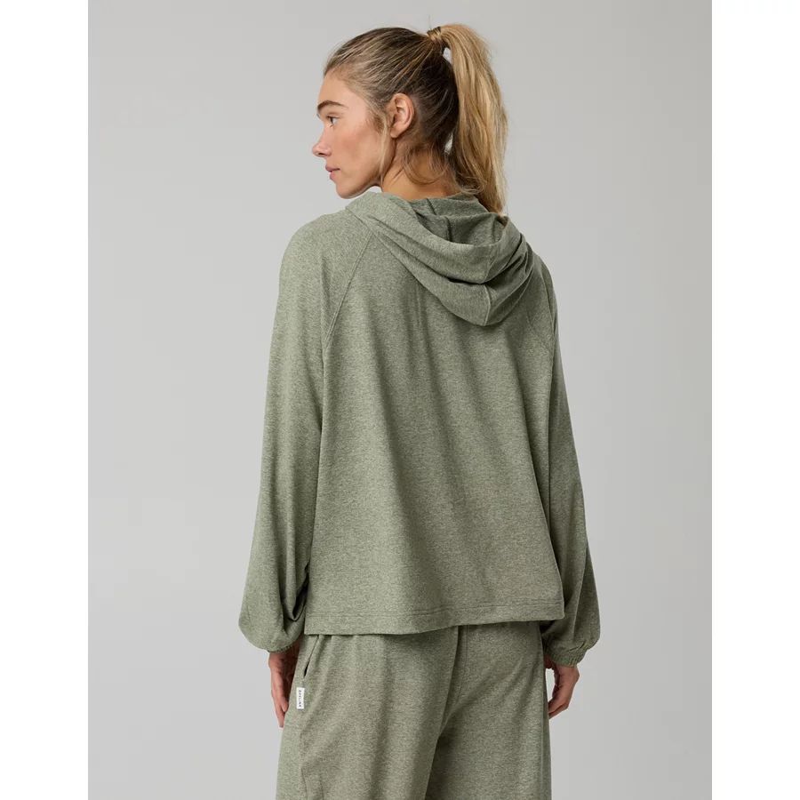 THE LOOK: Hoodie silhouette with puddle sleeves. Lightweight & slouchy. Front pocket.