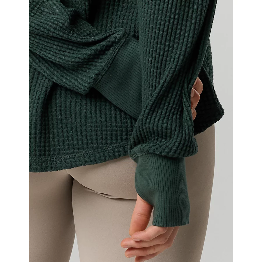 THE LOOK: Ultra-textured waffle knit. Notch neckline. Thumbholes.