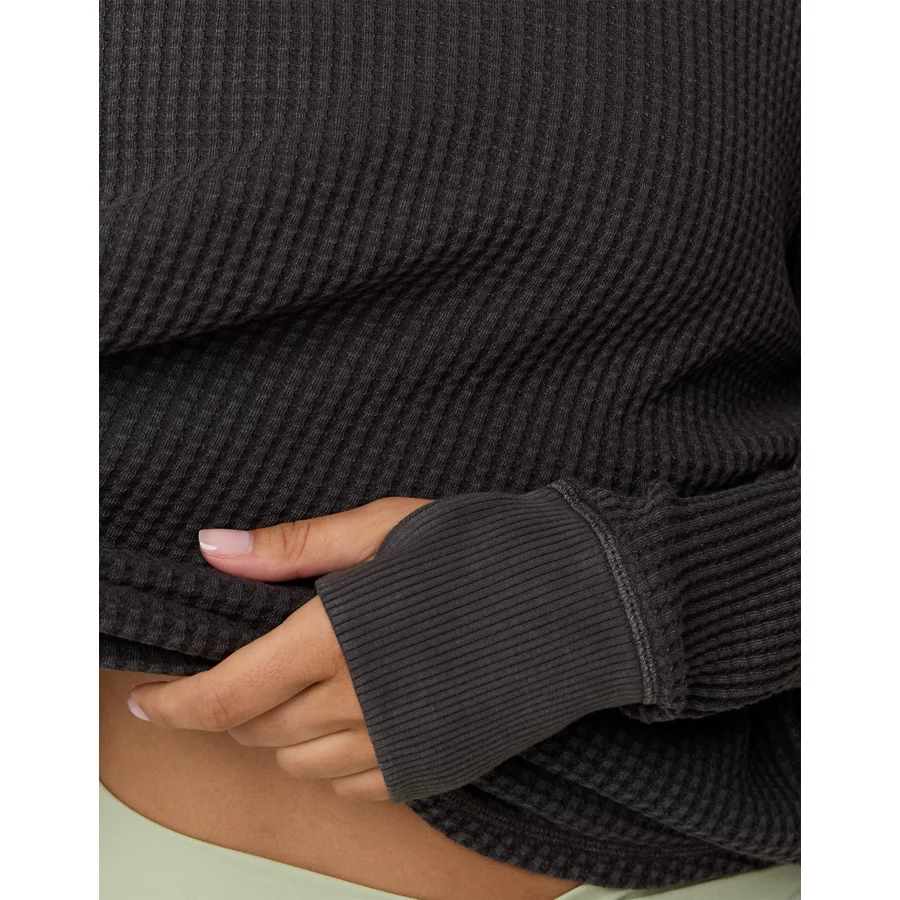 THE LOOK: Ultra-textured waffle knit. Notch neckline. Thumbholes.