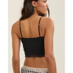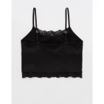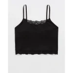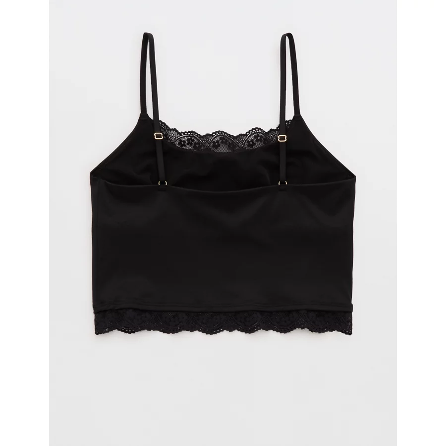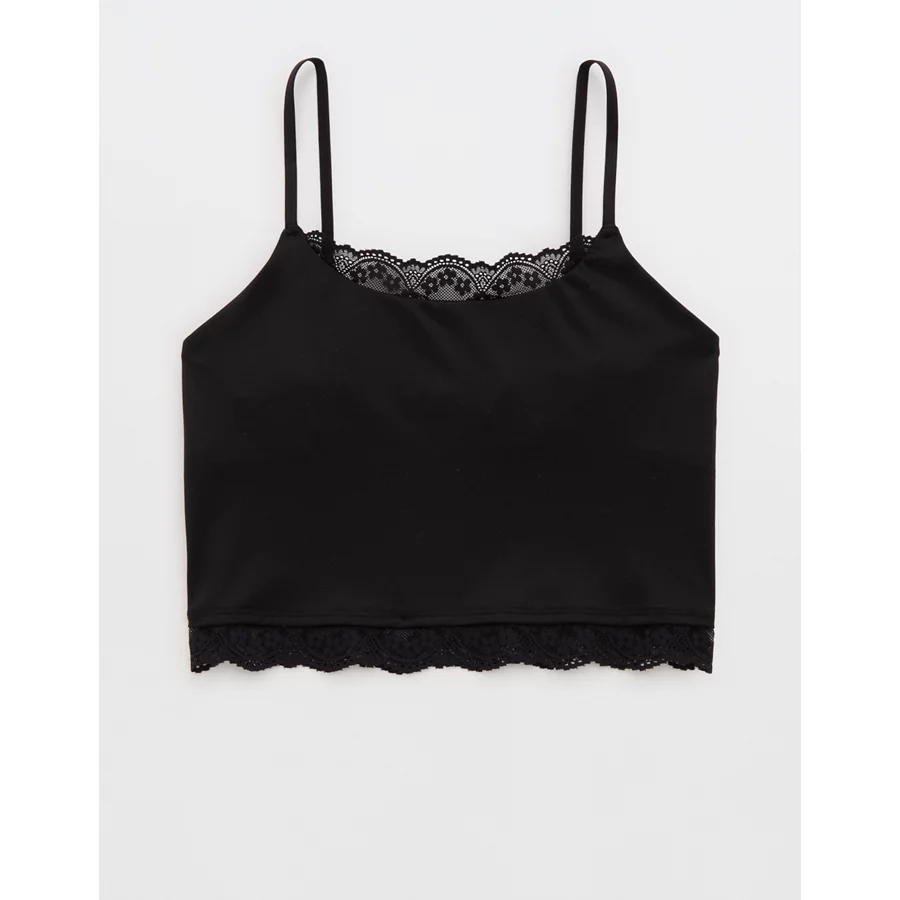 Design: Lace trim along neckline and bottom hem. Crop length hits at waist.